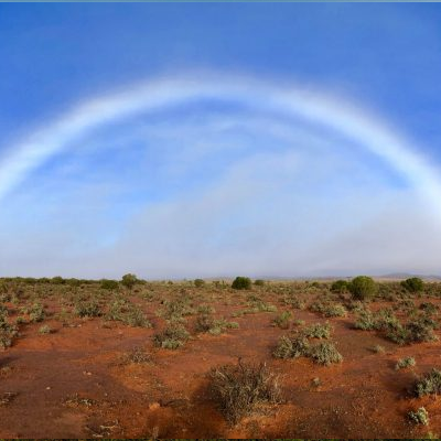A fog bow, sometimes called a white rainbow, is a similar phenomenon to a rainbow; however, as its name suggests, it appears as a bow in fog rather than rain. Because of the very small size of water droplets that cause fog—smaller than 0.05 millimeters (0.0020 in)—the fog bow has only very weak colors, with a red outer edge and bluish inner edge. The colors fade due to being smeared out by the diffraction effect of the smaller droplets.